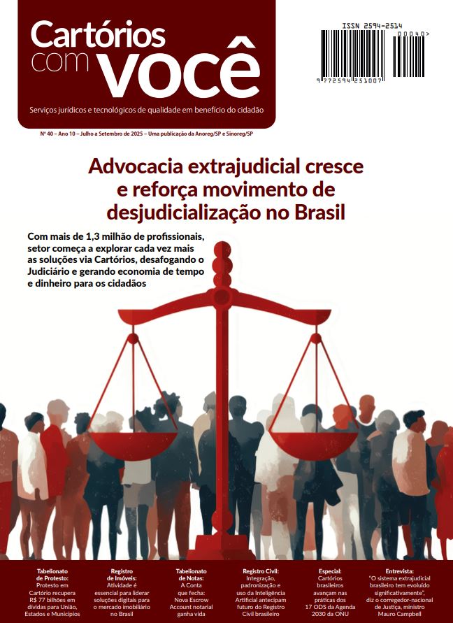 O Sindicato dos Notários e Registradores do Estado de São Paulo (SINOREG-SP) disponibilizou a edição n. 40 – Ano 10 – Julho a Setembro de 2025 da revista “Cartórios Com Você”. A publicação, de periodicidade trimestral, é produzida pelo Sindicato e pela Associação dos Notários e Registradores do Estado de São Paulo (ANOREG-SP). Nesta edição, a matéria de capa ressalta crescimento da desjudicialização e aumento da advocacia extrajudicial, o que tem contribuído para o desafogamento do Poder Judiciário e a utilização cada vez maior dos Cartórios.